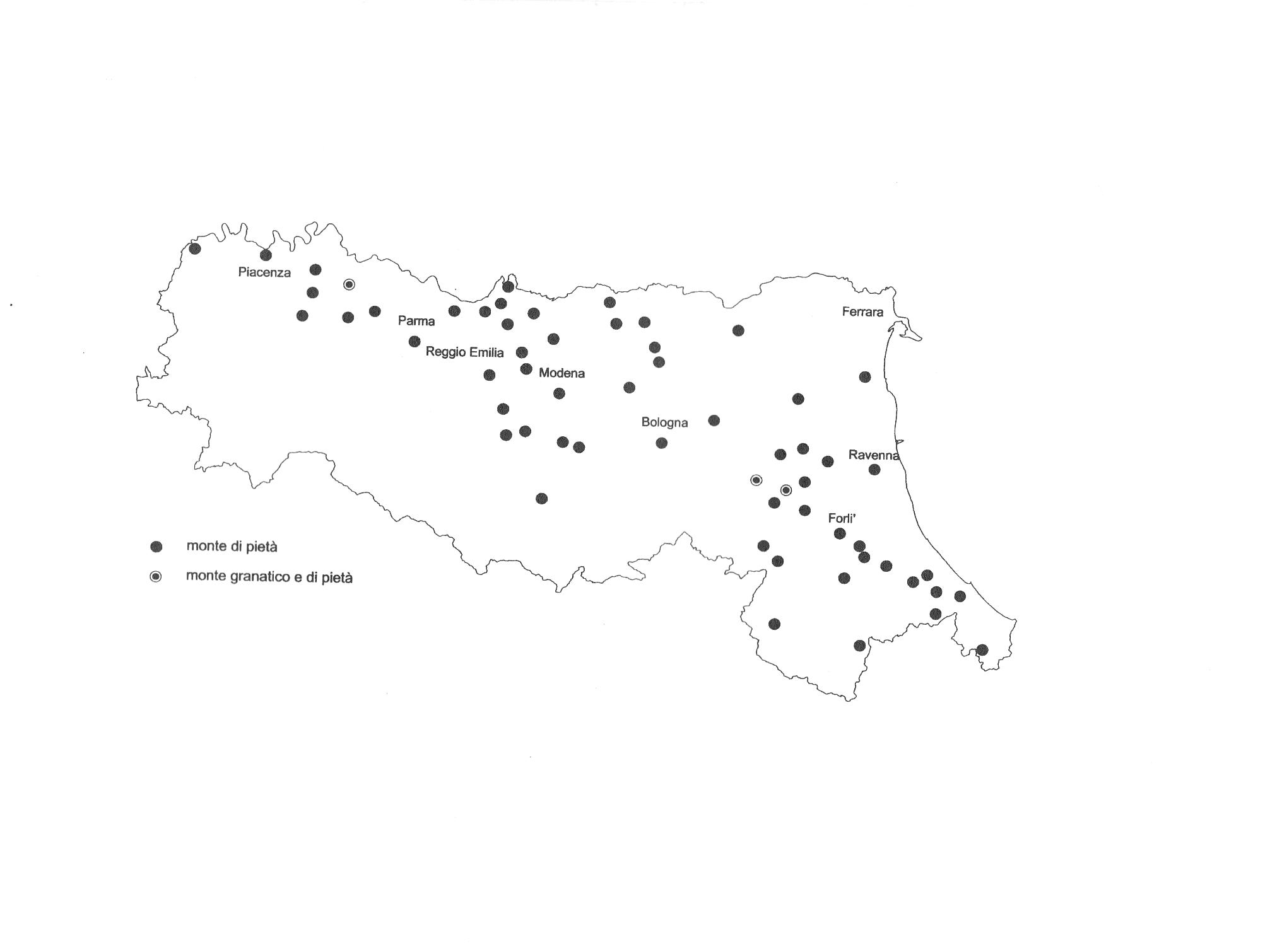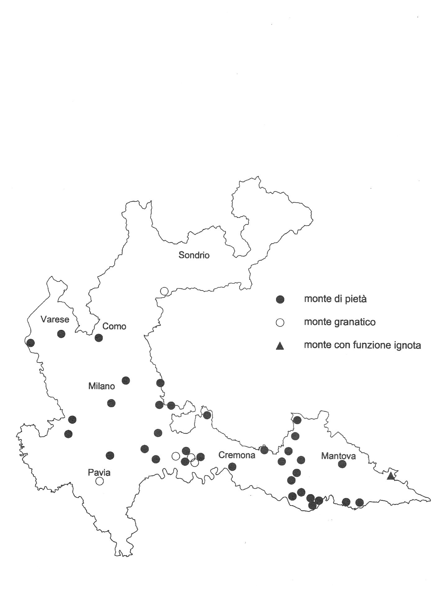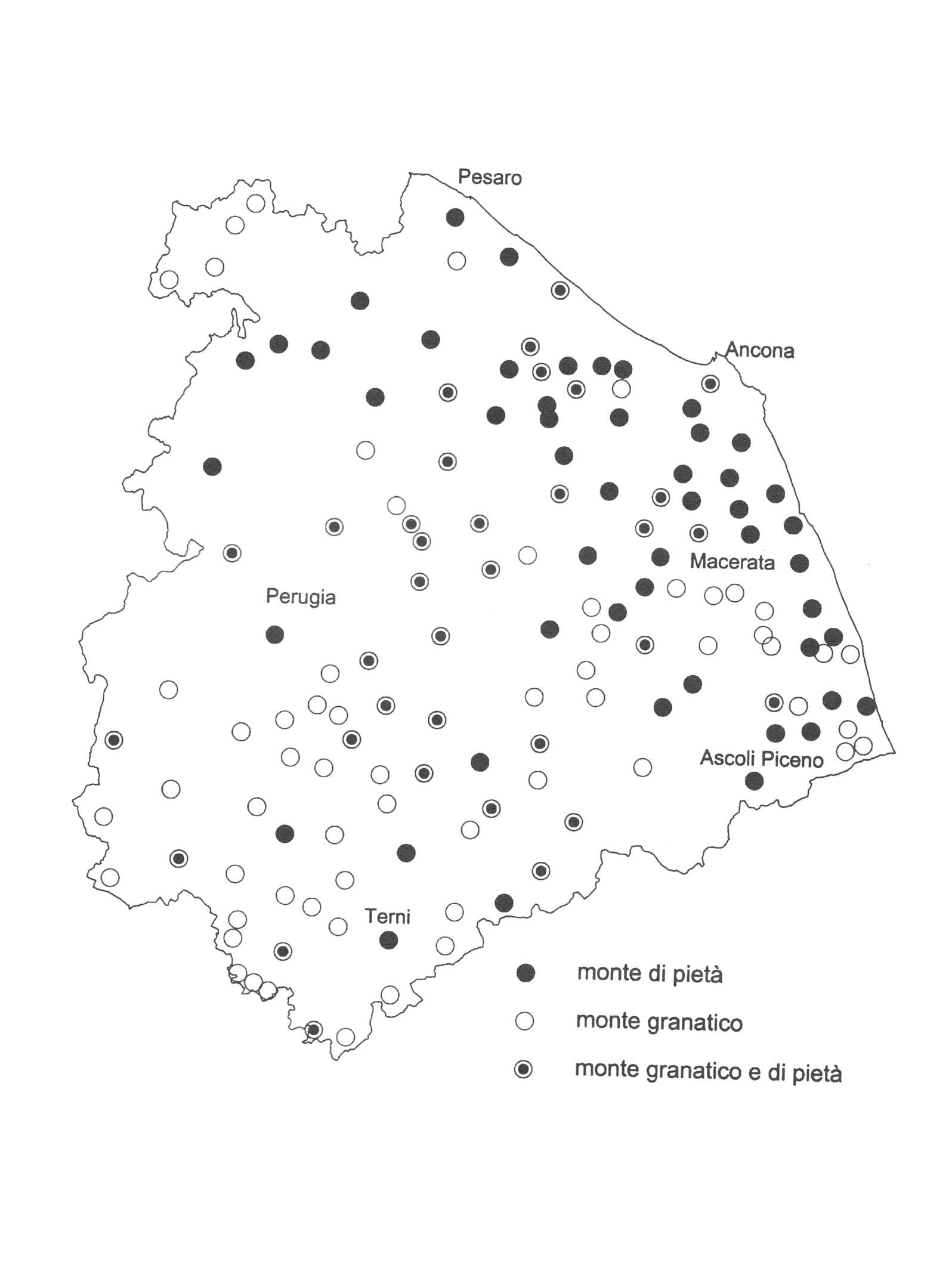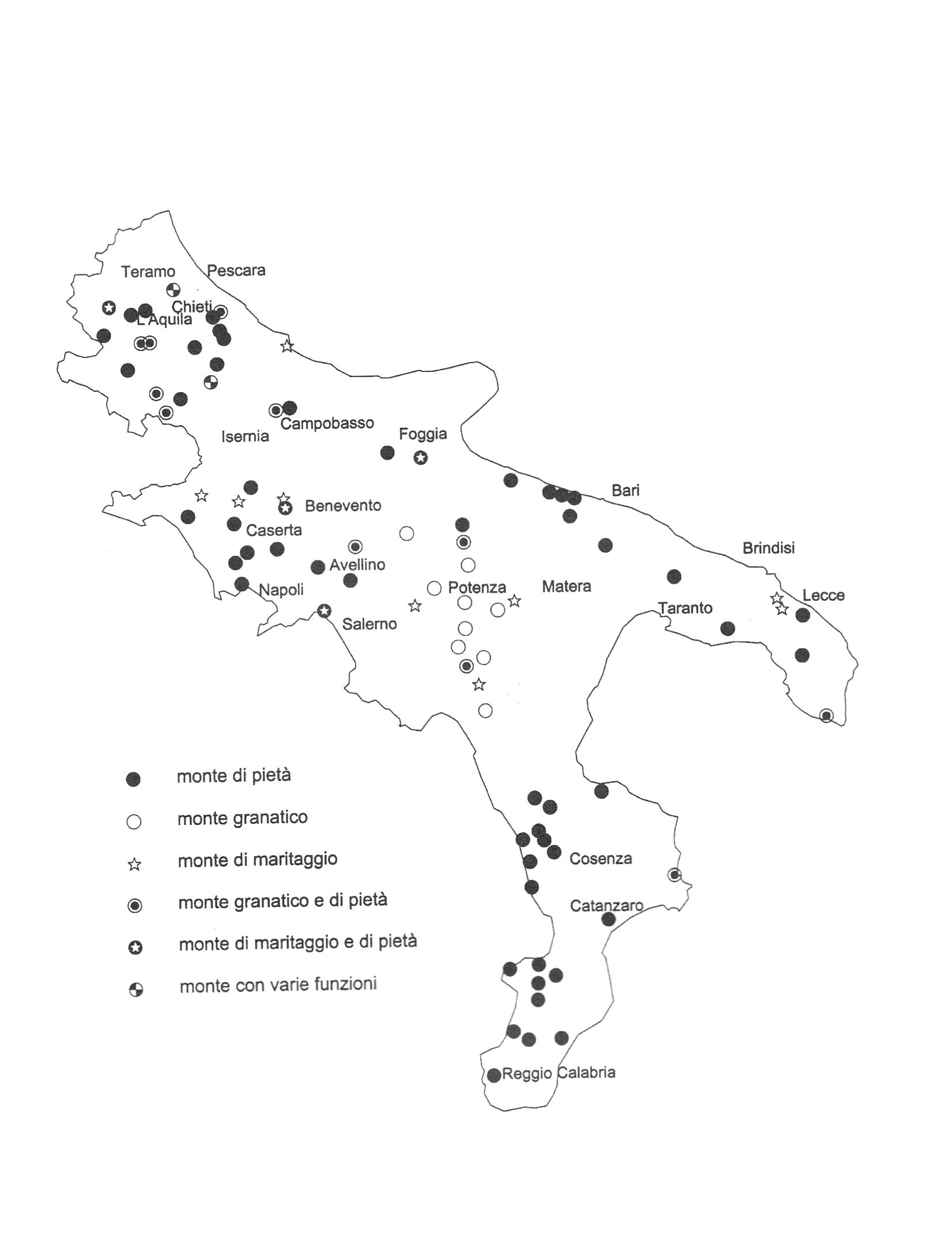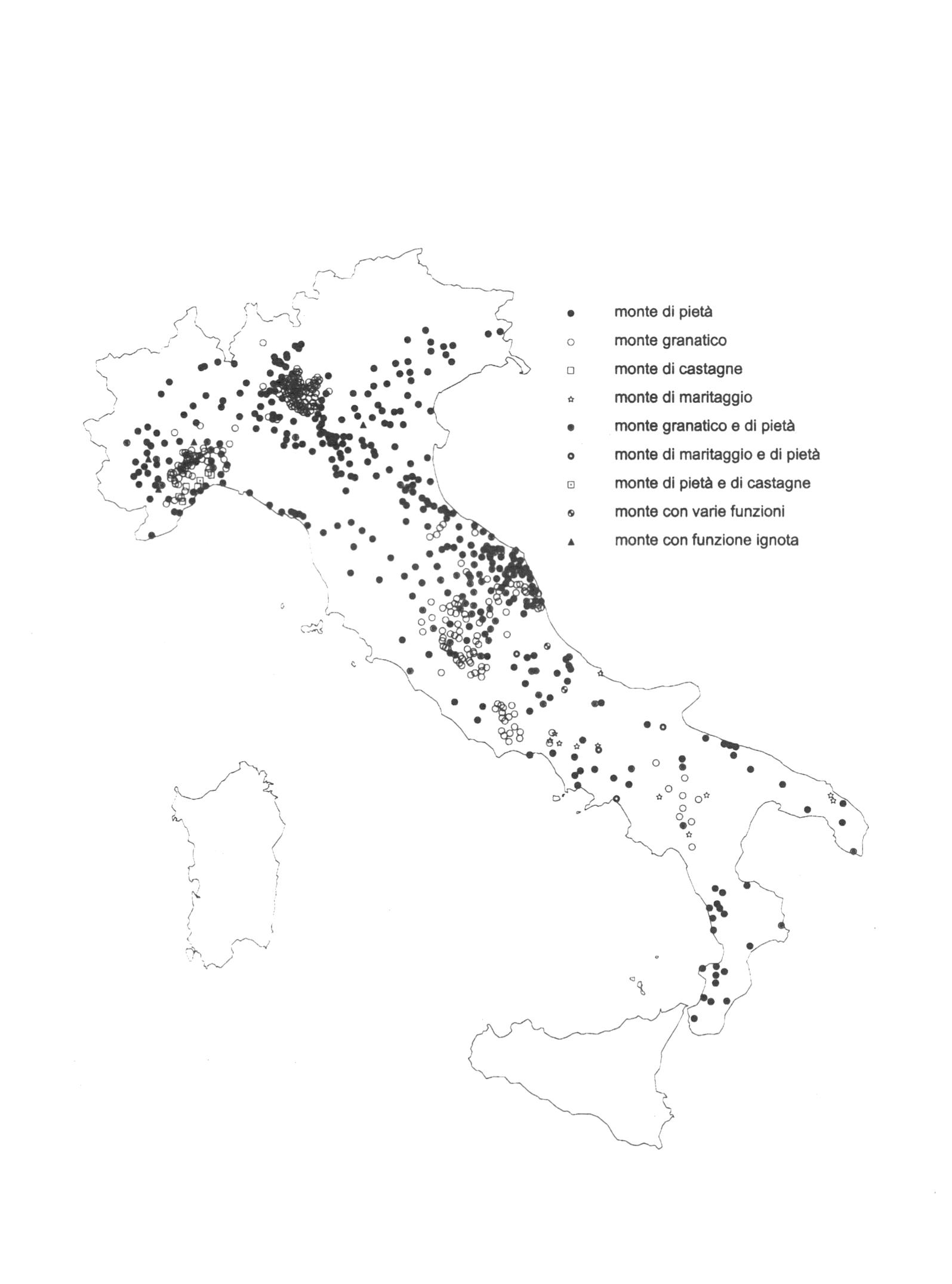 Le seguenti mappe forniscono una prima rappresentazione grafica della distribuzione dei Monti di Pietà, dei Monti frumentari, dei Monti delle castagne e dei Monti di maritaggio sul territorio italiano, divisi per aree geografiche.