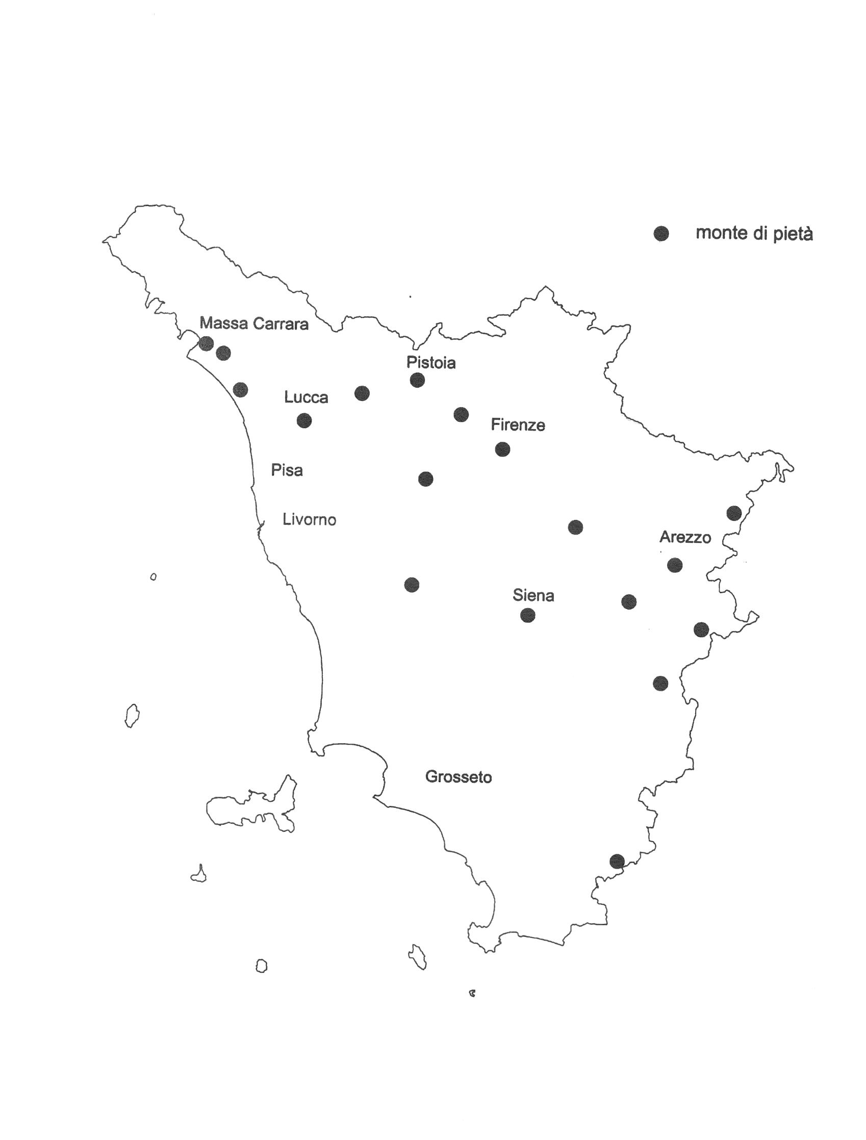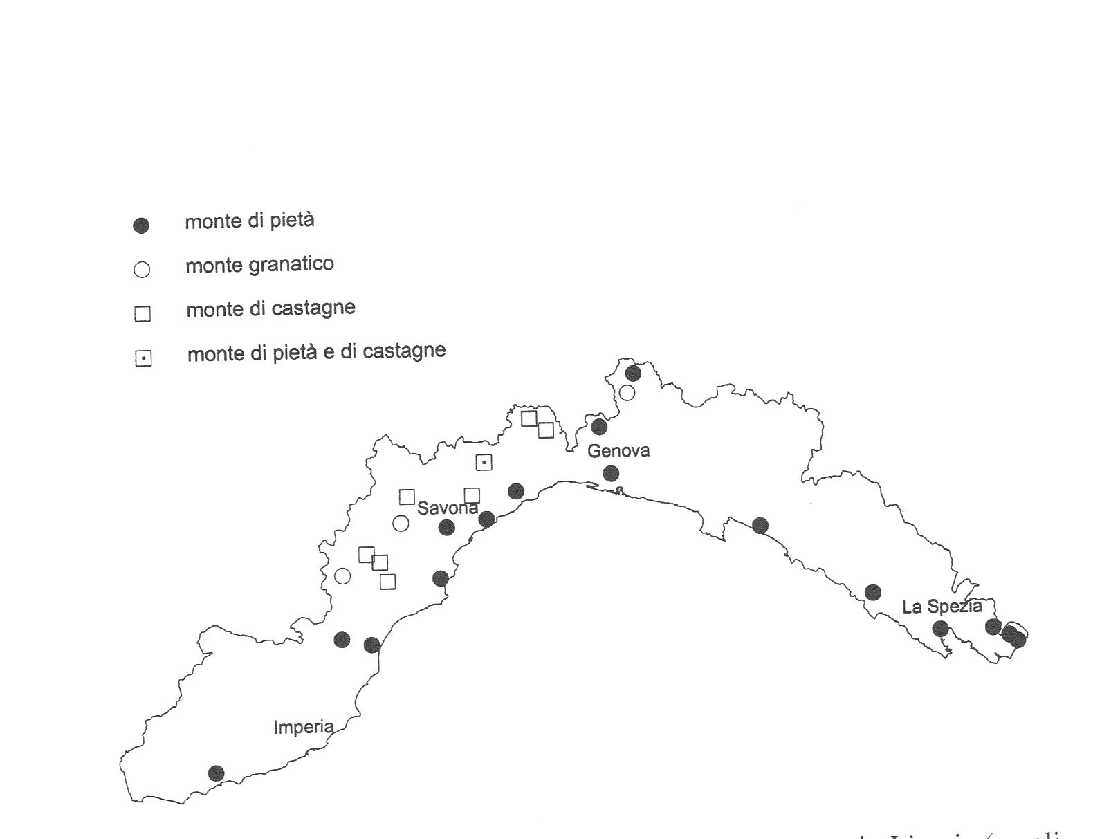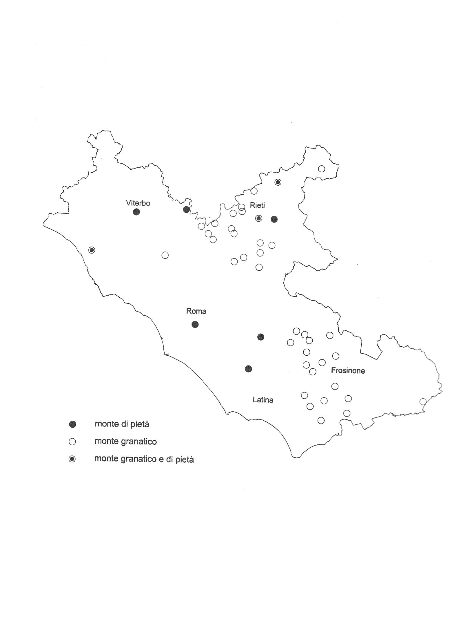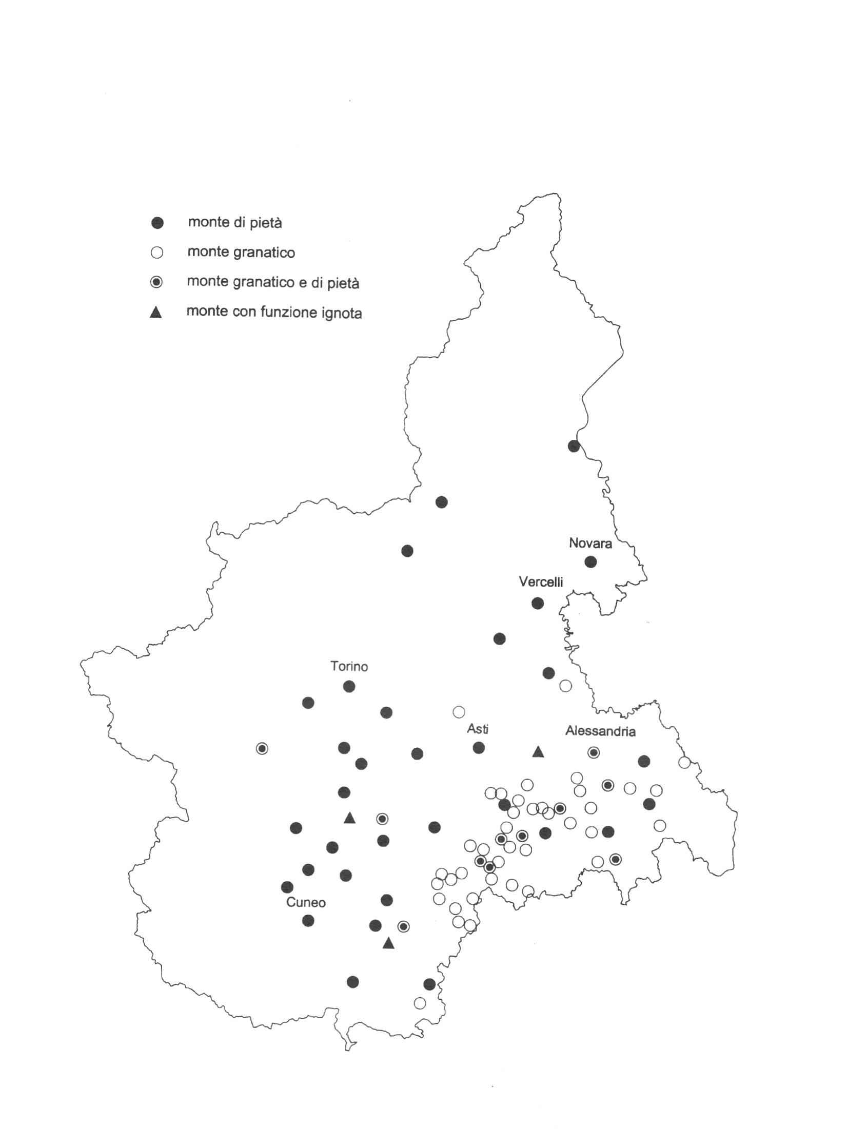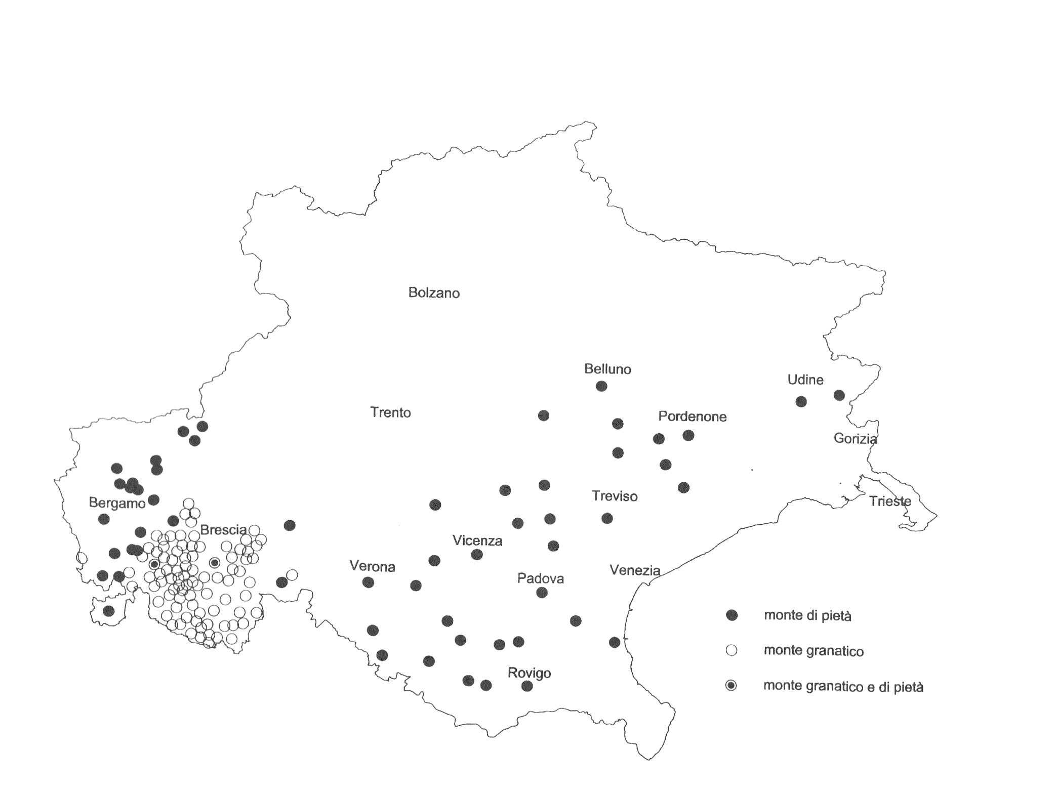 Le seguenti mappe forniscono una prima rappresentazione grafica della distribuzione dei Monti di Pietà, dei Monti frumentari, dei Monti delle castagne e dei Monti di maritaggio sul territorio italiano, divisi per aree geografiche.