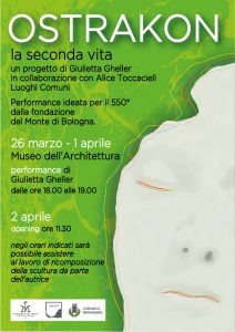 20 maggio 2023, ore 10.00-13.00 e 15.00-18.00 presso la Fondazione del Monte di Bologna e Ravenna: apertura delle sale che ospitano le opere dell’artista Giulietta Gheller; nel pomeriggio, Giulietta Gheller e Alice Toccacieli presenteanno il progetto artistico Ostrakon – La seconda vita