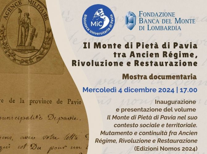 La mostra Il Monte di Pietà di Pavia tra Ancien Régime, Rivoluzione e Restaurazione sarà inaugurata mercoledì 4 dicembre alle ore 17 presso il Salone Teresiano della Biblioteca universitaria di Pavia (Strada Nuova 65). Curata da Mario Rizzo, docente di storia economica all’Università di Pavia, e promossa e finanziata dalla Fondazione Banca del Monte di Lombardia, sarà visitabile dal 5 dicembre 2024 al 1 marzo 2025.