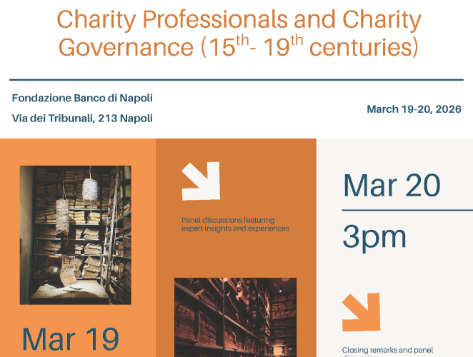 La Fondazione Banco di Napoli ospiterà infatti il secondo workshop internazionale “Charity Professionals and Charity Governance (XV–XIX centuries)”, con l’Istituto di Storia dell’Europa Mediterranea del CNR, l’Universität Graz e il Centro studi sui Monti di Pietà e sul credito solidaristico. Scopo dell’incontro è quello di approfondire il ruolo svolto dalle istituzioni caritative nella società europea tra tardo Medioevo e XIX secolo, con particolare attenzione al progressivo sviluppo di strutture amministrative e modelli organizzativi più formalizzati e ai processi di professionalizzazione del personale coinvolto nella gestione di questi enti.